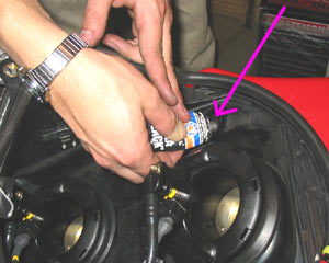 And now, there is one last step for true 'emissions' removal, and that is the huge rubber restrictors in the intakes designed to reduce noise emission. They rob power and are easily removed. Start by stripping off the side fairings and front upper fairing. Then, you'll see the runners have a bunch of screws through them. You'll need to take all the screws out (there's about 30 of them!) to get the runners apart.