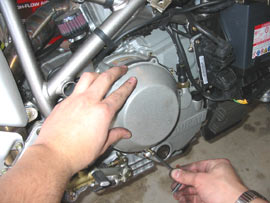 | Here's a cheap little trick- if you have a dry clutch but don't have the bucks for a vented cover, you can still swing it. Start by removing the stock cover (make sure your bike has a dry clutch!), then blow out the dust built up inside. You won't need to remove two of the bolts (the ones that don't hold the cover on indicated by the larger holes on the cover) You'll find a lot of dust in there. Then, head down to the hardware store and find some 5/16" inner diameter (double check your bolt size) aluminum spacers. Then place the spacers behind the cover over the bolts, then apply some RTV silicone or Locktiteto each bolt and tighten the whole assembly back down. |