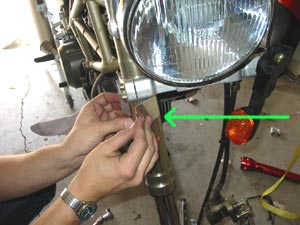 After that, you can undo all four fork mounting bolts on each side, carefully noting how far above the top triple clamp the stock forks sat, that way you can match up the new forks and not upset the handling. Loosen the bolts and slide the stock tubes out.